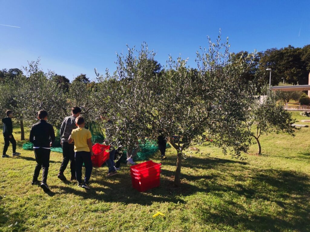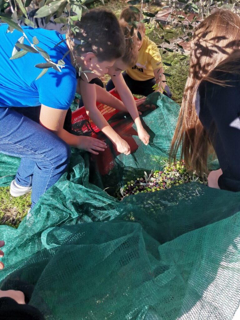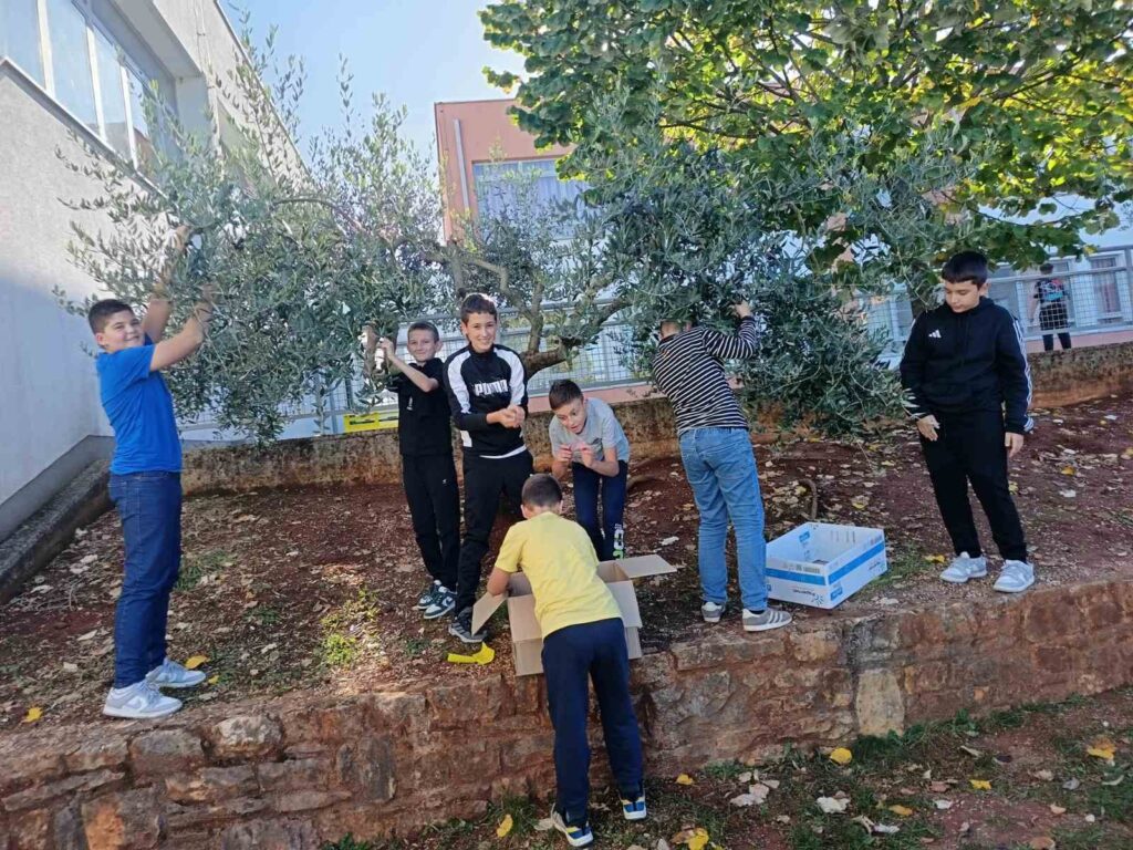 Kada dođe vrijeme branja maslina, učenici se rado uključuju. S obzirom na to da su se već uhodali, nisu potrebne posebne pripreme. Učenici sami znaju postupak, odmah uzimaju mrežu za branje u ruke i postavljaju je ispod masline. Vrijednim rukama i malim grabljicama pažljivo pobiru masline, a potom sve što je ubrano, stavljaju u košare uz stručno nadziranje školskog domara i učitelja. Ove je godine urod bio nešto manji, no mi smo i dalje ponosni na naš maslinik i maslinovo ulje.