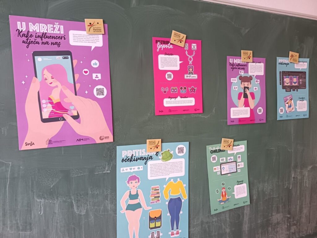 Radionicu smo započele razgovorom o društvenim mrežama te smo im postavile pitanja poput: „Koliko vremena provodite na internetu?“ i „Koje aplikacije najčešće koristite i koje influencere pratite?“. Na ta su pitanja učenice odgovarale iskreno, konkretno i s velikim zanimanjem. Nakon uvoda, nastavile smo s praktičnim zadatcima: prepoznavanjem promjena na slikama poznatih osoba, osmišljavanjem nastavka zadanog scenarija, crtanjem filtera te analiziranjem načina na koje javne osobe uređuju svoje objave.